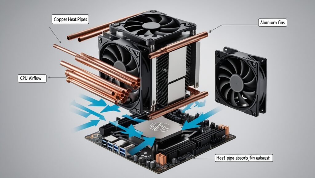 - Heat Pipes (Most Modern Coolers): Sealed copper tubes containing a small amount of liquid that rapidly vaporizes at the hot end (touching the CPU/GPU) and condenses back to liquid at the cooler end (in the fins). This phase-change process is incredibly efficient at moving heat away from the source and spreading it throughout the fins.